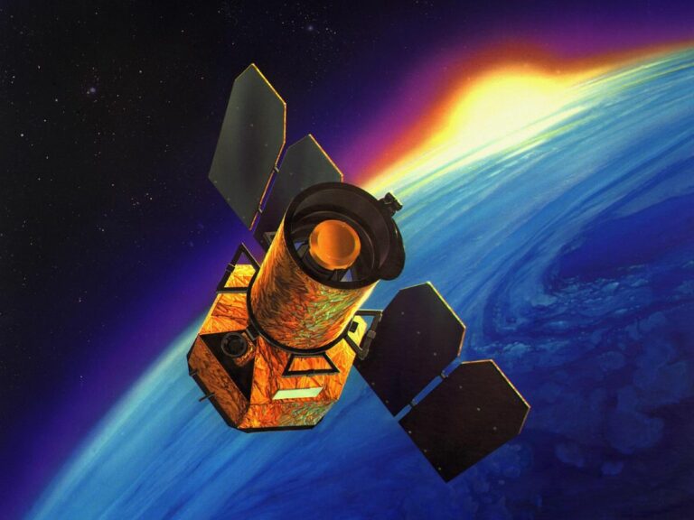 An illustration of the Galaxy Evolution Explorer was launched on April 28, 2003. (Image credit: Artist’s concept of Galaxy Evolution Explorer)